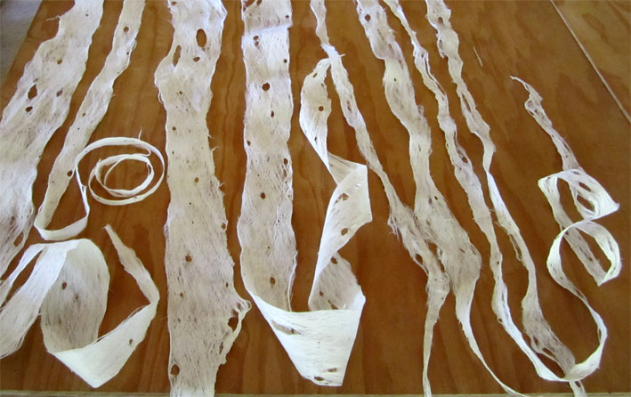The Samoan tapa was specially commissioned in 3 m lengths as just one layer and is of coarser fibre because of its length. The Tongan tapa consists of several layers of very finely beaten bast which are glued together with tapioca starch to form a more solid sheet. The holes that are found in regular intervals result from branches that grow from the stem. They are usually removed from the plant at an early stage to keep the holes small. For my purpose, the holes were a bonus, because they make the bark appear lacy. In the beginning I carefully separated the layers in their dry state, a hard job and often less successful than I had wished.